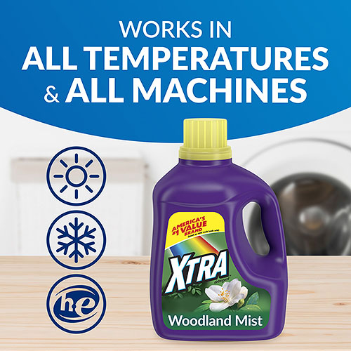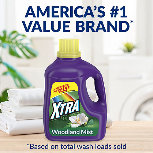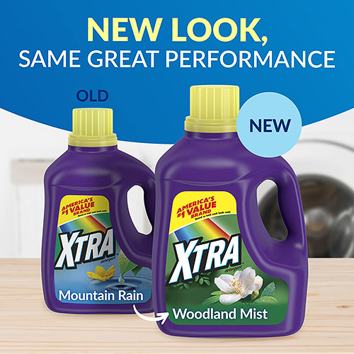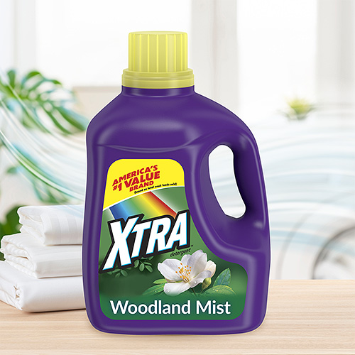 Escape to a peaceful, lush forest in every laundry load with XTRA Woodland Mist Liquid Detergent (formerly XTRA Mountain Rain). Its formula delivers an effective clean that leaves laundry with a scent of fresh-picked herbs, iris blossoms, and the earthy richness of rain-kissed timber.