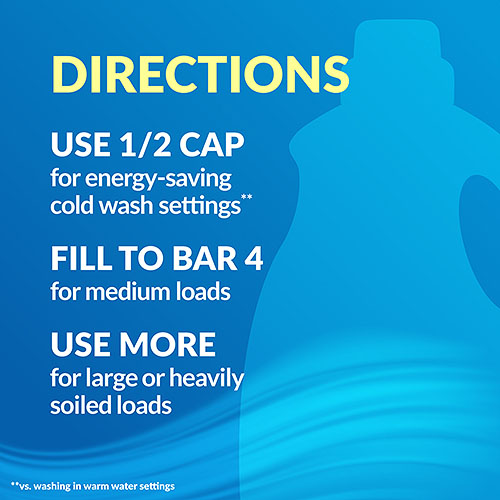 Works in standard and high efficiency (HE) washing machines in all wash temperatures, even cold water. To use, fill cap to the top of Bar 4 for medium loads or one-half capful for energy-saving cold wash settings (vs. washing in warm water settings). Use more for large or heavily soiled loads. This laundry detergent liquid has a convenient measuring cup for a perfect wash every time.